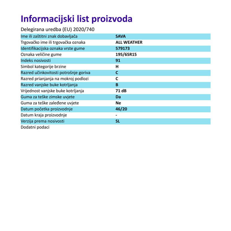 Naslovna » Proizvod » Auto guma 195/65 R15 SAVA 91H All Weather TL